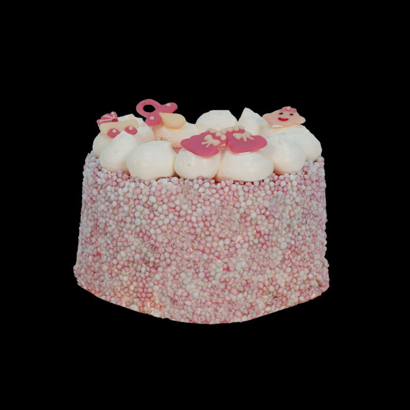 Hoera, een meisje! Vier dit mooie moment met ons roze geboortetaartje. Afgewerkt met muisjes, roze chocolade en lieve babyversiering - perfect om de geboorte of babyshower extra feestelijk te maken.