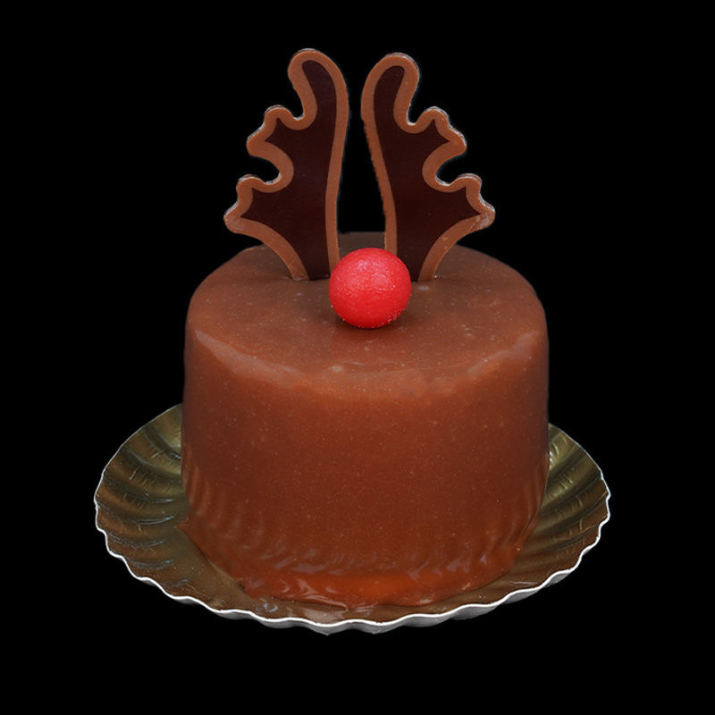Luchtige vanillecake gevuld met romige chocolademousse, overgoten met een glanzende chocolade spiegel en feestelijk afgewerkt als Rudolf.