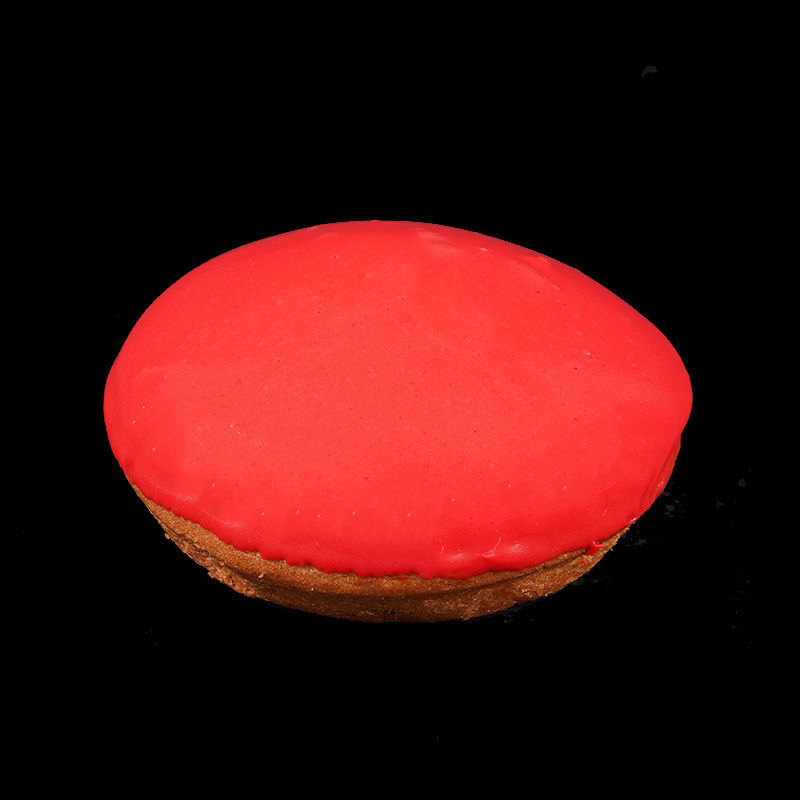 Malse koek, overgoten met een dikke laag glanzende rode fondant – een vrolijk kerstmomentje.