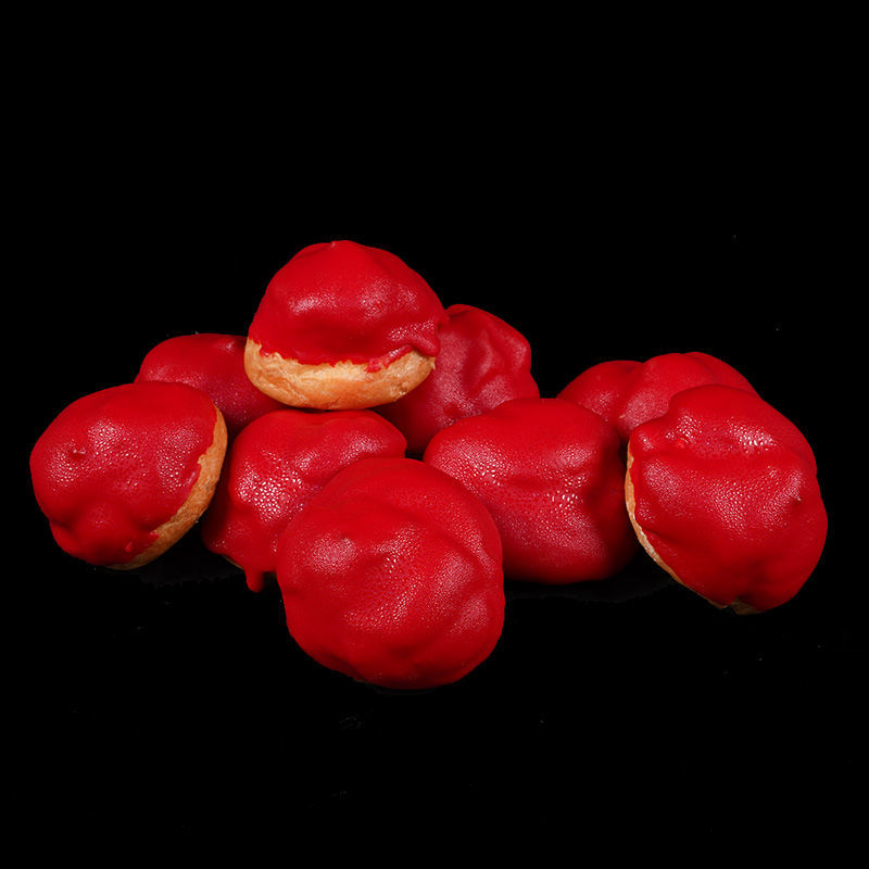 Mini slagroomsoesjes, feestelijk gedipt in glanzende rode chocolade.