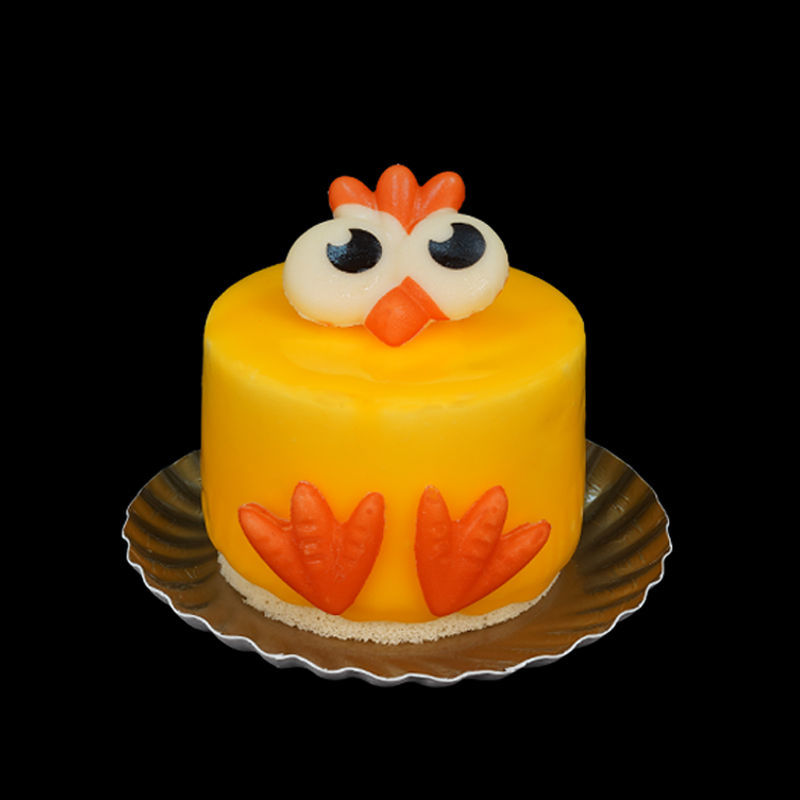 Laat je verleiden door ons Kip Gebakje! Een luchtige vanille cakebodem, gevuld met een verfrissende yoghurt-passievrucht-perzik bavarois en afgewerkt met een onweerstaanbare chocolade spiegellaag. Het gebakje is speels gedecoreerd als kip, waardoor het een vrolijke en heerlijke eyecatcher is voor jouw Paasfeest!