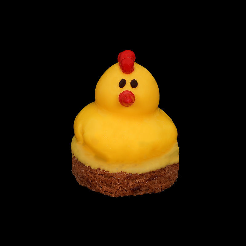 Kuiken koninkje: Koekbodem gevuld met frangipane en vanille bavarois, gedecoreerd als Kuiken