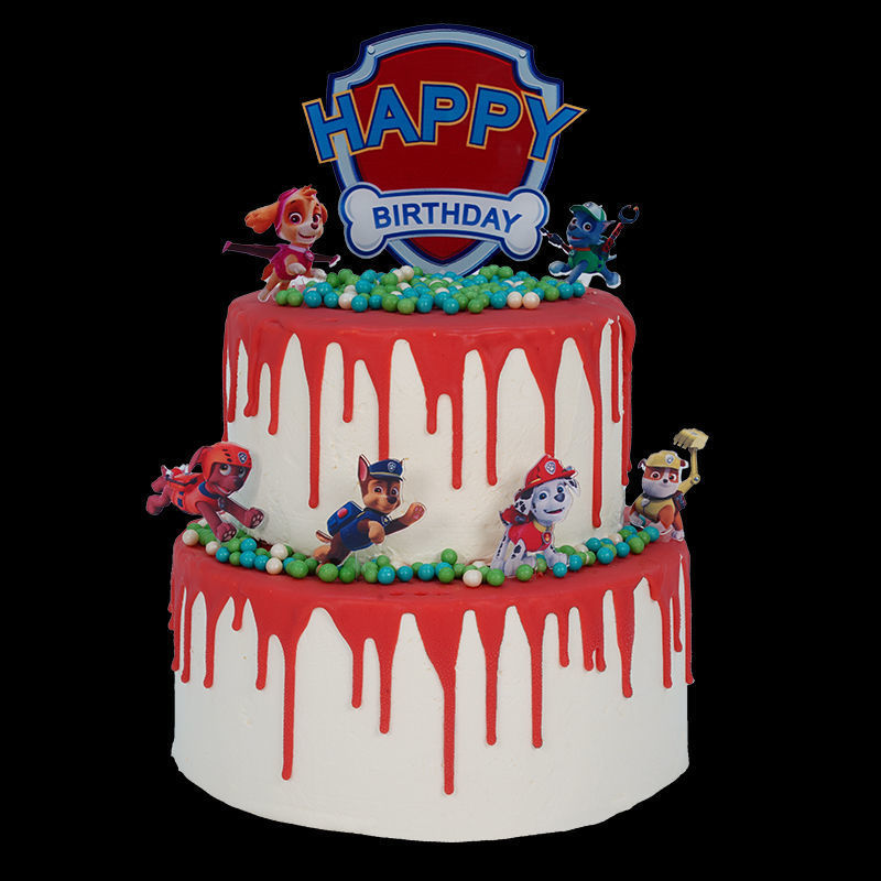 Onze themataart is een echt doe-het-zelf-feestje! De taart bestaat uit 2 losse lagen gevuld met romige M&M-bavarois (gemaakt met de blauwe M&M’s) en afgewerkt met een vrolijke rode chocolade drip. Thuis stapel je de lagen zelf én versier je de taart met de meegeleverde Paw Patrol versierset, sprinkels en eetbare lijm. Zo maak je samen met de jarige je eigen feesttaart – het feestje begint al bij het versieren!
